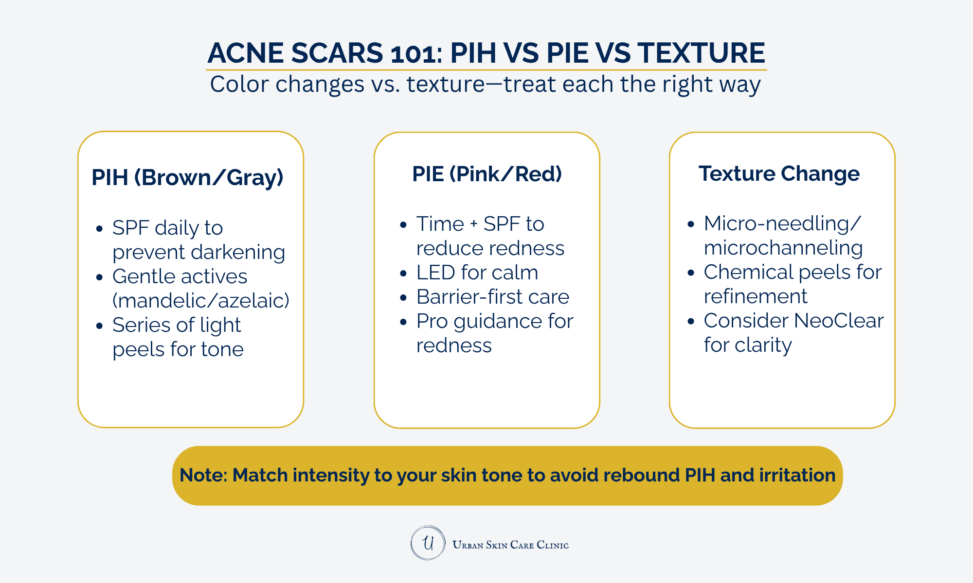 It depends on the type. Post-inflammatory hyperpigmentation (PIH) and post-inflammatory erythema (PIE) are often called “scars,” but they are different from true textural scarring. PIH shows up as brown or gray marks after a breakout, particularly in deeper complexions; PIE appears pink or red in lighter complexions. These color changes tend to fade gradually with sun protection and the right ingredients.