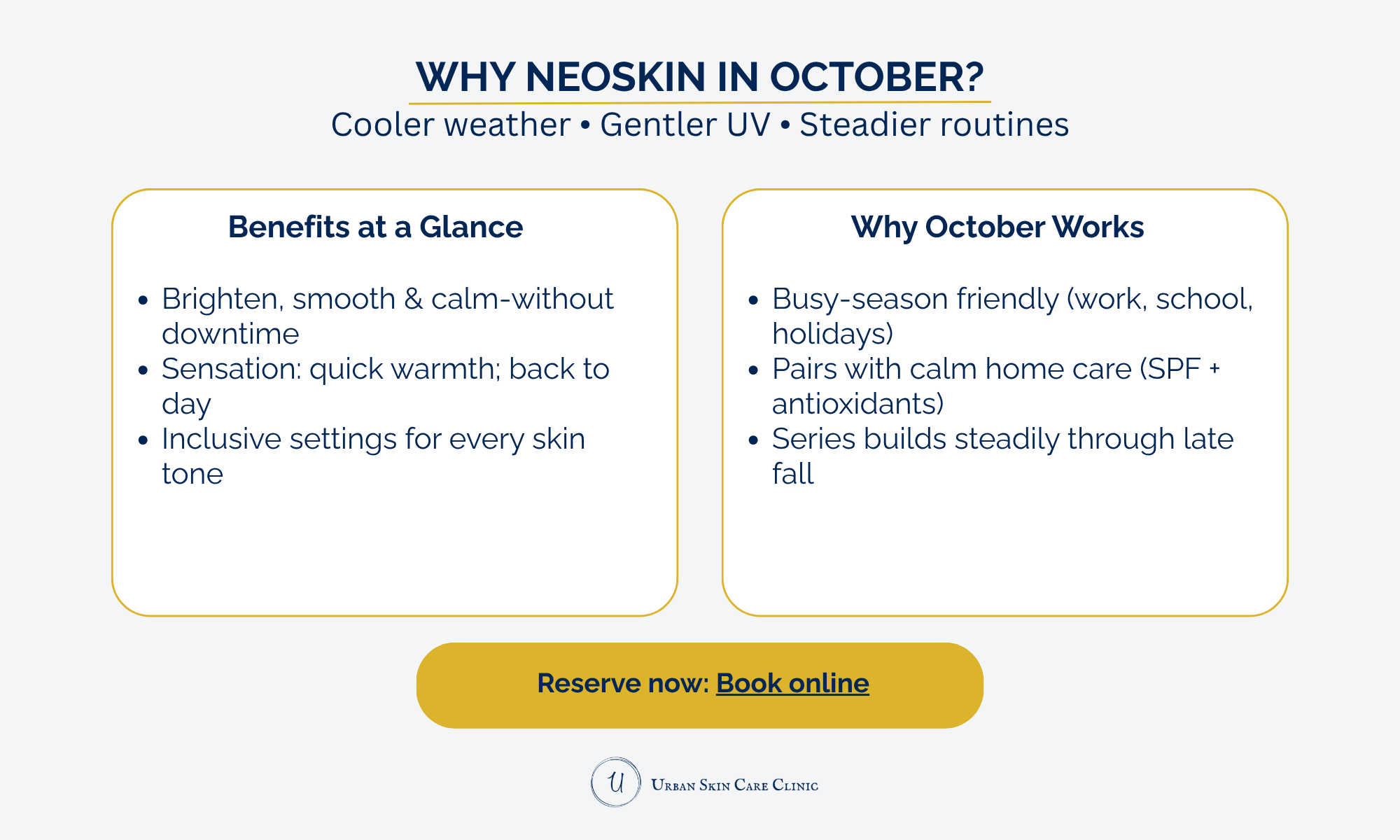October also offers logistical benefits for a NeoSkin series. With fewer outdoor pool days and less intense UV, it is simply easier to be consistent with sunscreen and protective habits. That consistency is what allows improvement to compound. We can line up a schedule that carries you through the season, usually three to six visits depending on goals, and plan a maintenance cadence for the new year.