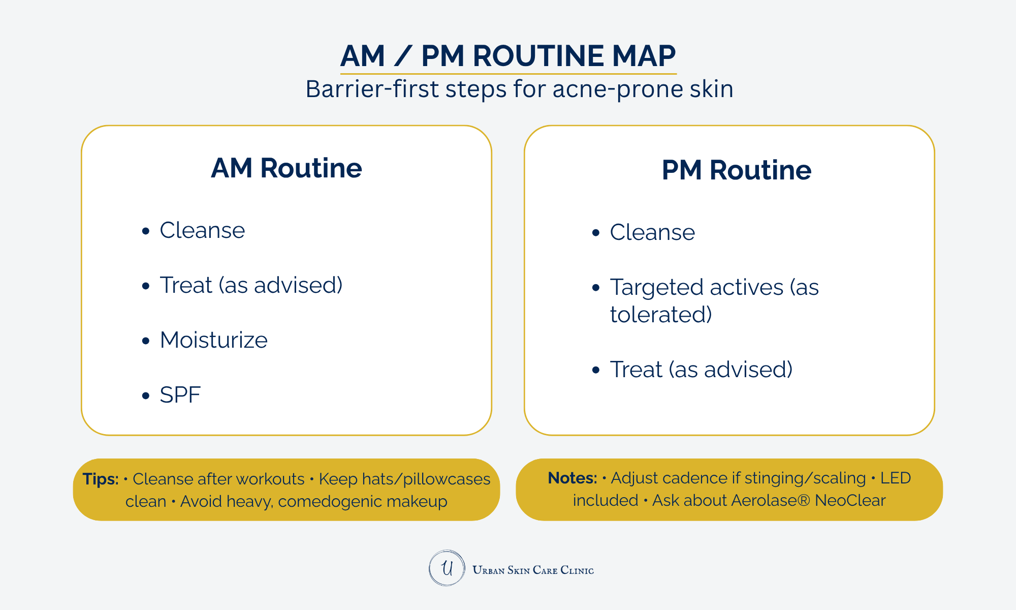 - Relapse prevention: Acne is cyclical for many people. We’ll set a sustainable maintenance schedule (think: monthly or seasonal tune-ups) and keep your home routine realistic and sustainable.